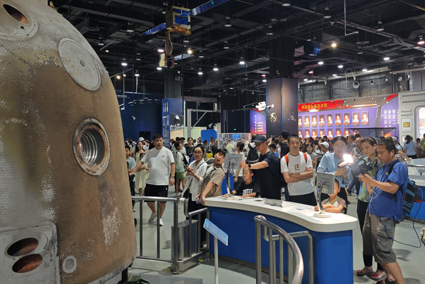 8月16日开展的“星海征途·大国重器”中国航空航天科技主题展,正在甘肃科技馆掀起暑期科普热潮。作为全国科普月预热活动的重要组成部分,本次展览以“空天探索·国防力量·科技传承”为主线,通过50件凝聚着民族智慧的国之重器模型,打造沉浸式科普体验,为公众呈现兼具思想性与体验感的“国家科技公开课”。展览一经推出即广受追捧。其中1:1原大原样“天宫二号”实验舱和“天和”核心舱模型、歼-20隐形战斗机、武直-10直升机、“剑齿虎装甲车”、S26T常规动力潜艇等特色展项成为热门打卡点。据统计,开展前两日累计接待观众4.2万余人次,首日2.12万人次的客流量更是创下甘肃科技馆单展历史纪录。青少年观众占比突出,多所中小学将其列为暑期研学实践地。家长纷纷反馈:“展览让孩子真切感受国家科技腾飞,是培养民族自豪感的生动课堂。”